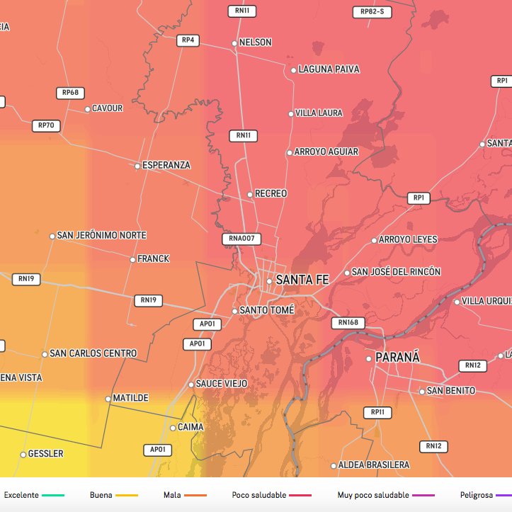 Según indica AccuWeather la calidad del aire en la ciudad de Santa Fe y la región es “poco saludable”. Las personas pueden experimentar dificultad para respirar e irritación de la garganta tras una exposición prolongada. Hay presencia de partículas finas (con un diámetro inferior a 2,5 micrómetros) contaminantes que son inhalables, pueden entrar en los pulmones y en el torrente sanguíneo y provocar graves problemas de salud.